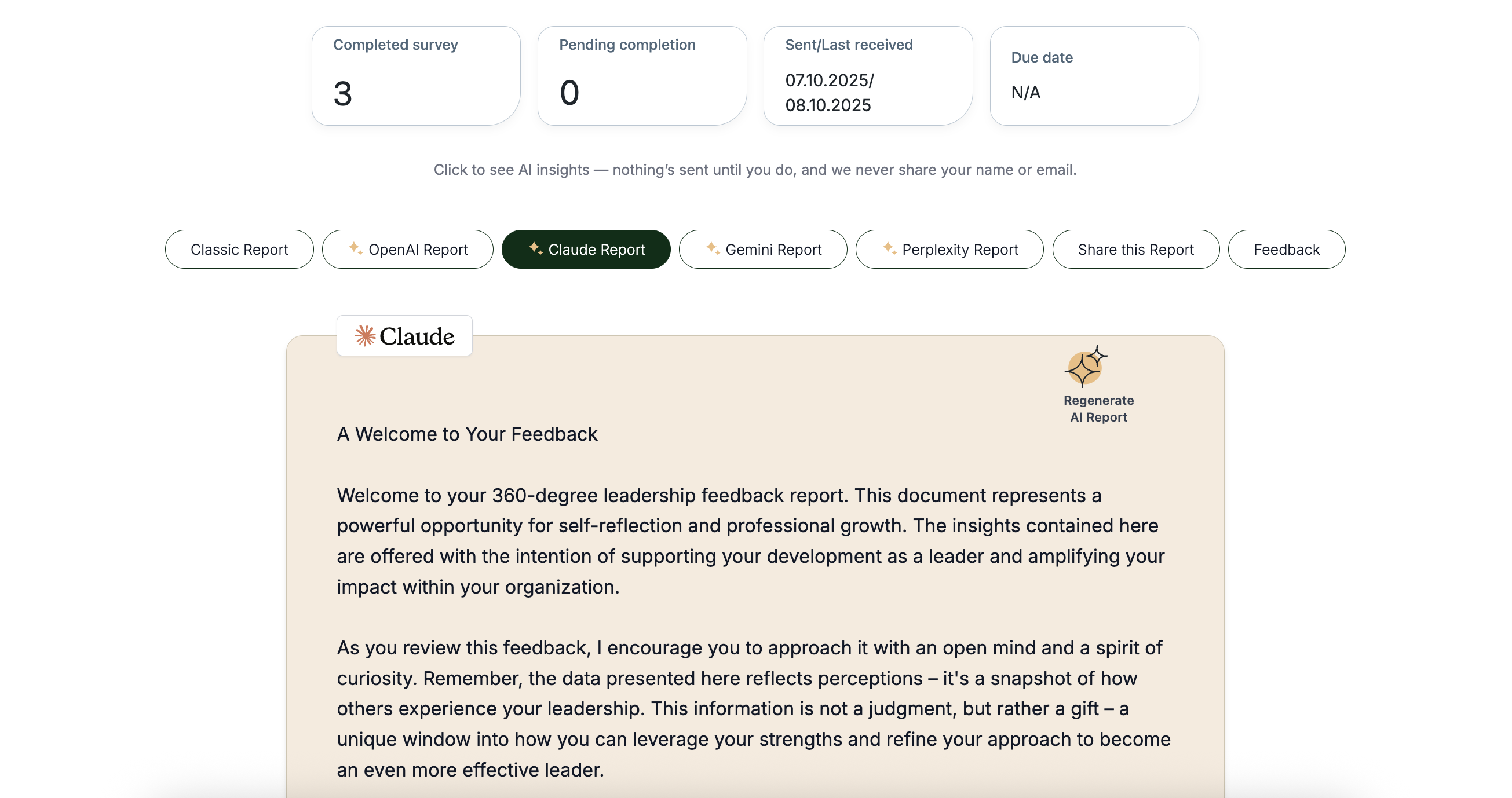 Every survey produces a standard report and an AI report. Both are ready to use in a session — no extra work needed.